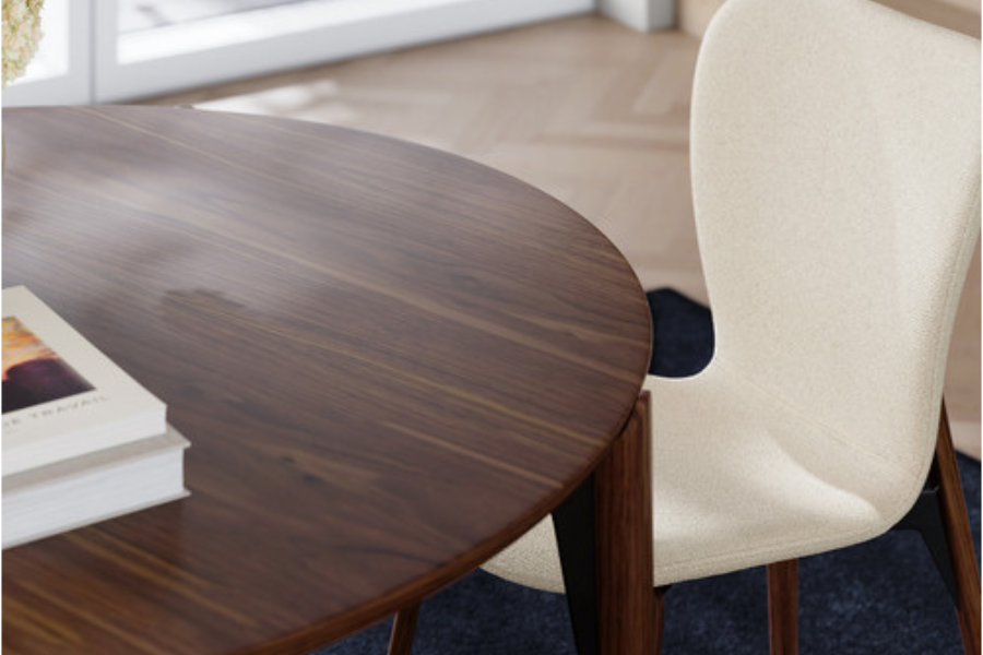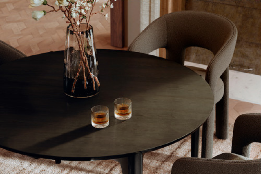 The table, featuring a black-stained ash veneer top, creates a natural yet elegant focal point, while its rounded shape enhances flow and warmth within the space. The uniquely designed legs ensure stability and highlight craftsmanship.