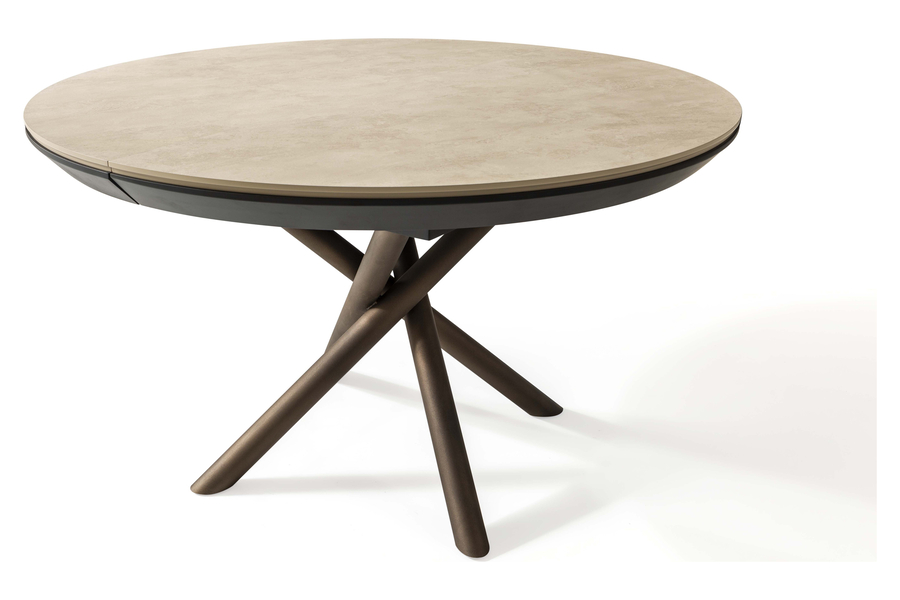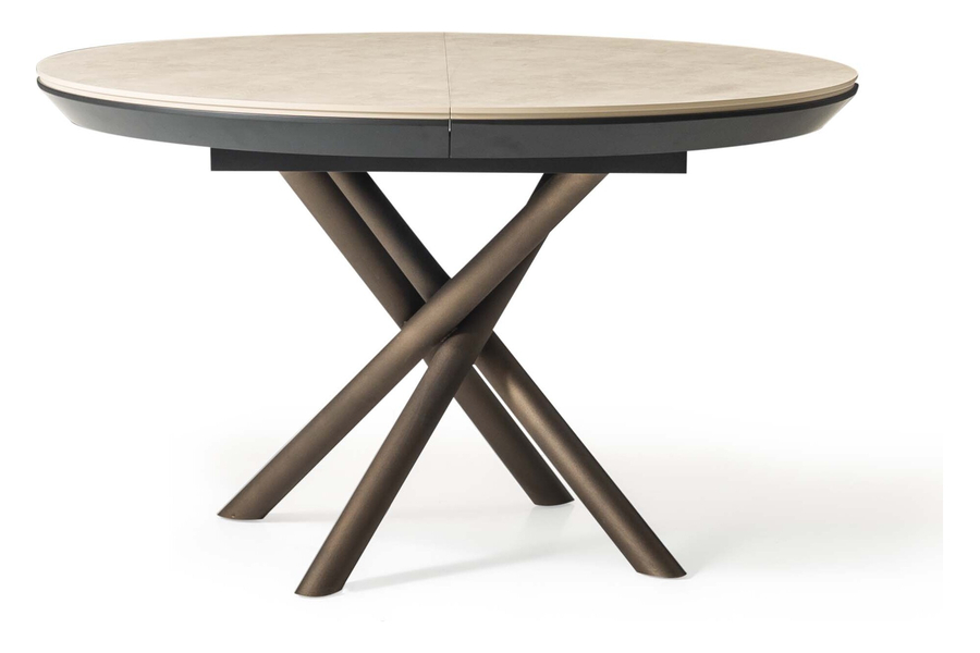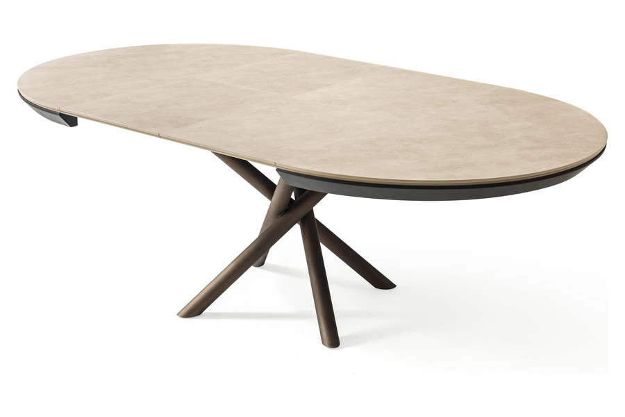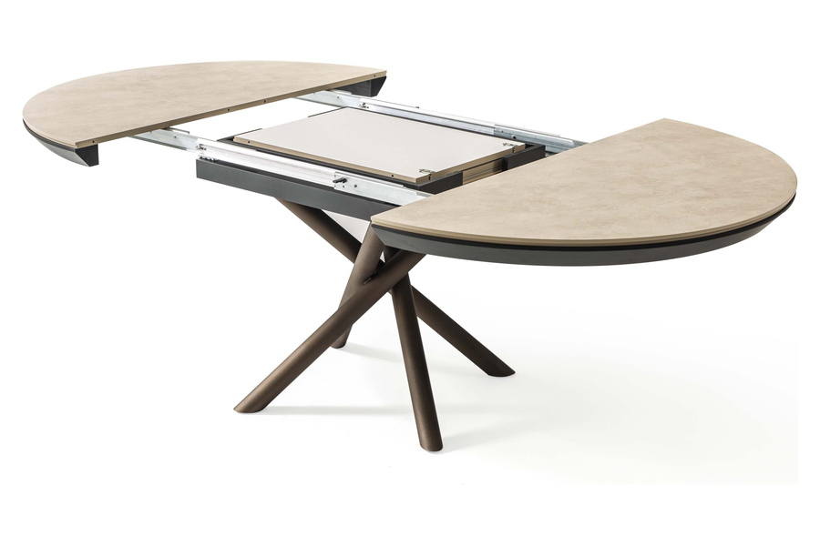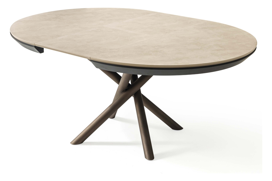 The crossed metal base adds a modern feel and total stability, while the extension mechanism transforms it from a stylish round table to an impressive oval shape.
