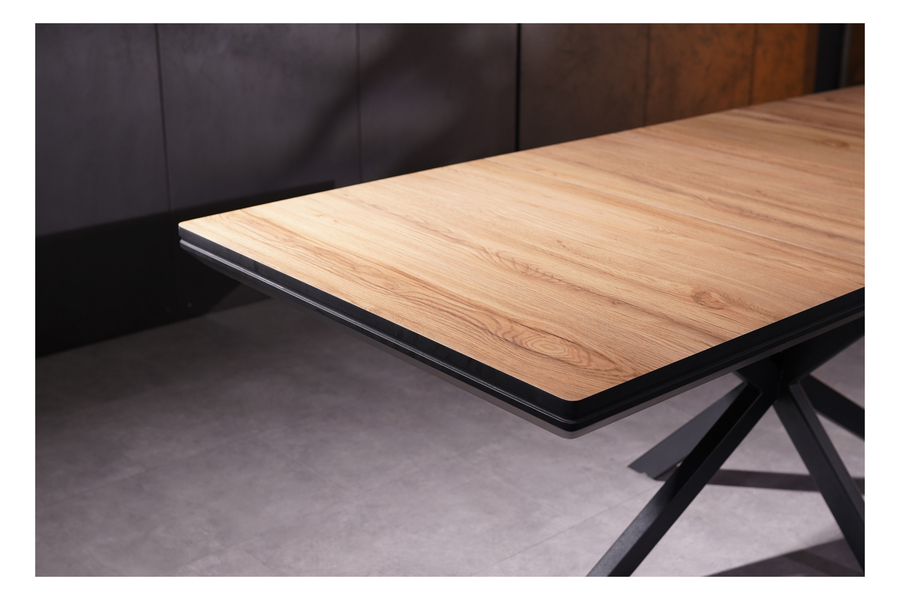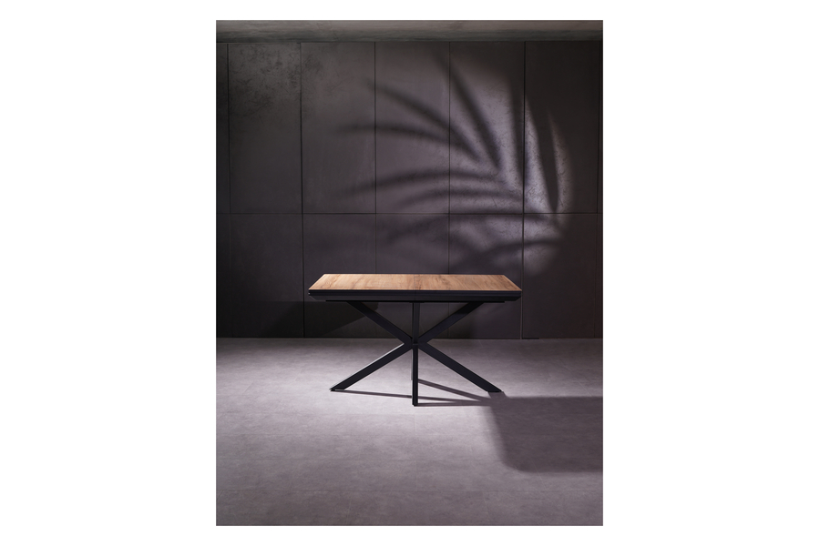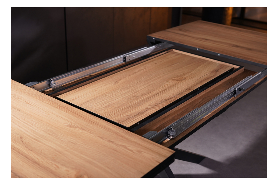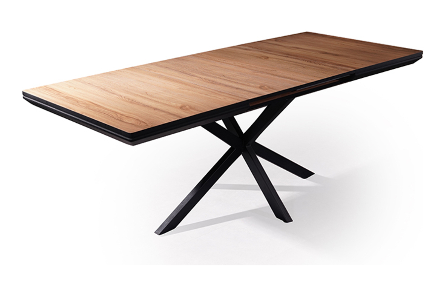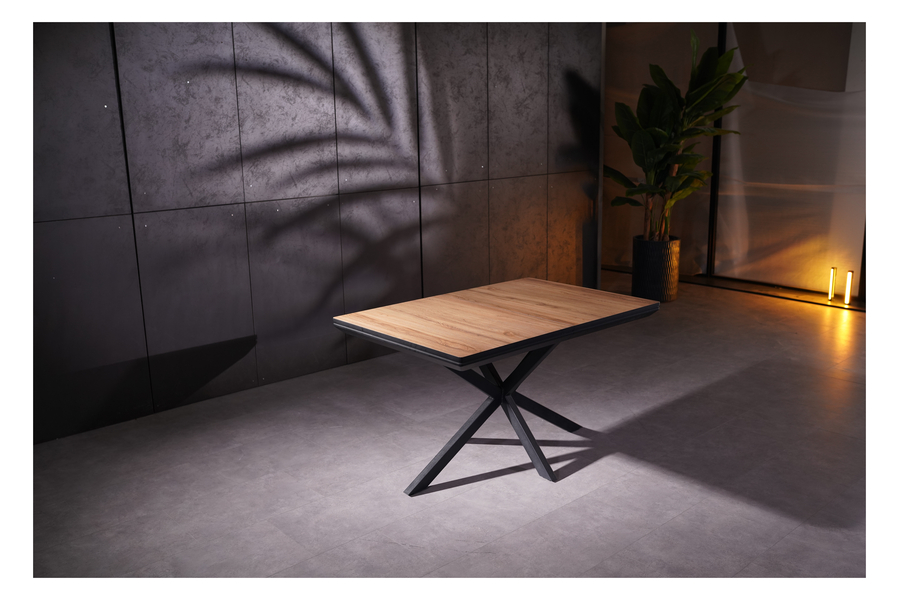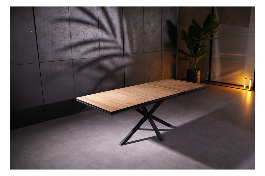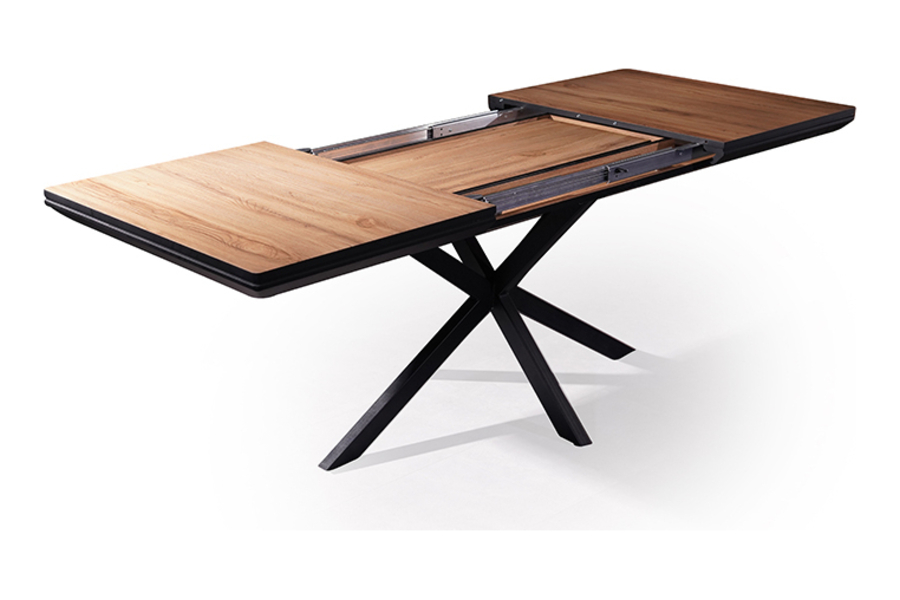 The X-shaped metal base ensures stability and balance while adding a contemporary touch to the overall design. The extension mechanism operates smoothly, allowing effortless adjustment for additional seating when needed.