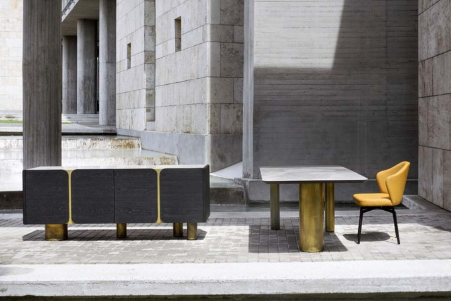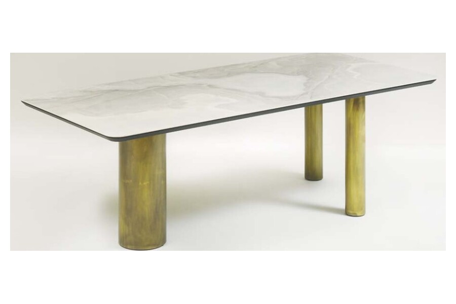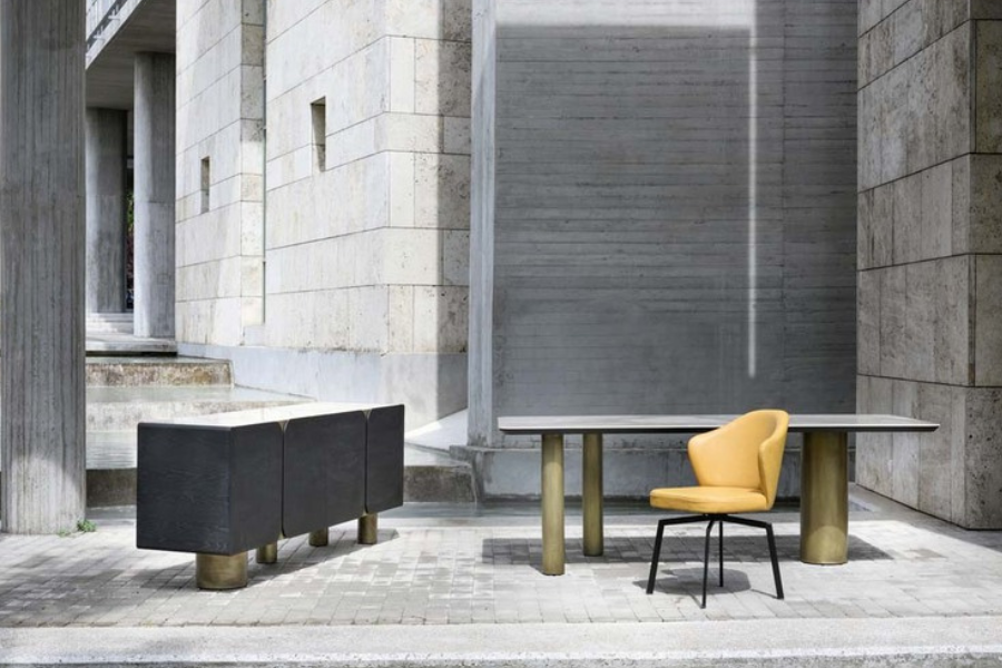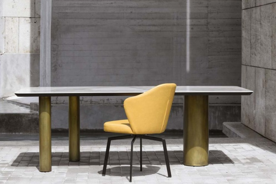 The distinctive cylindrical metal base in warm metallic finishes creates a strong architectural presence, elevating the table into a sculptural centerpiece. The combination of materials enhances its premium aesthetic.