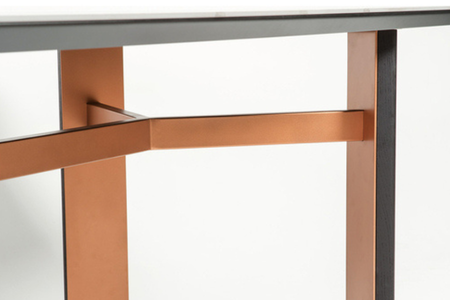 The tabletop features a marble-effect finish in dark tones, offering a luxurious appearance and refined aesthetic. The natural veining enhances its character and gives each piece a unique touch.