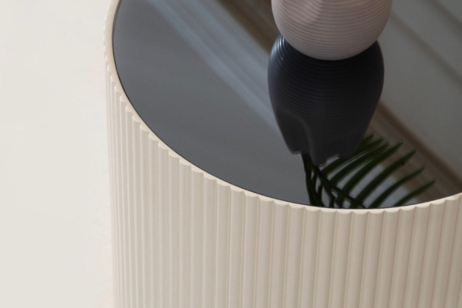 Its round design combined with a vertically ribbed base adds architectural interest and visual balance to the room.